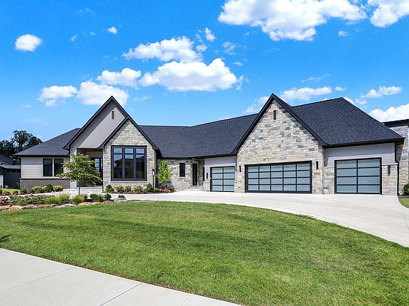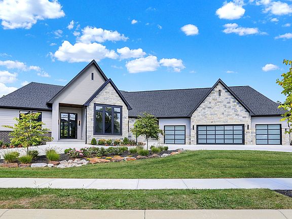 This sprawling contemporary ranch offers stunning water views in the gated Chatham Ridge. Designed with a Modern American style, the home features an open-concept floor plan perfect for everyday living. Beautiful wood ceilings and natural stone accents are showcased throughout the home. The circular driveway leads to a spacious 4-car garage with a brand-new epoxy floor, offering both functionality and style. The beautiful kitchen is a chef's dream, boasting custom cabinetry, an Elbrus quartz waterfall countertop, and a large butler's pantry. The primary suite, located on the main level, includes a serene master bath and a master closet with a hidden door for easy access to the laundry and mudroom. The lower level is perfect for hosting guests, unwinding, and entertaining, featuring a large living area, a secret bourbon room, a wet bar, a game area, a projector screen, and two additional bedroom en suites. Step outside to the covered patio with a fireplace, where you can relax and enjoy the tranquil pond views. The built-in grill makes it easy to host outdoor gatherings and soak up the sunshine. Chatham Hills is Westfield's premier golf course community, offering a wealth of amenities for the entire family!