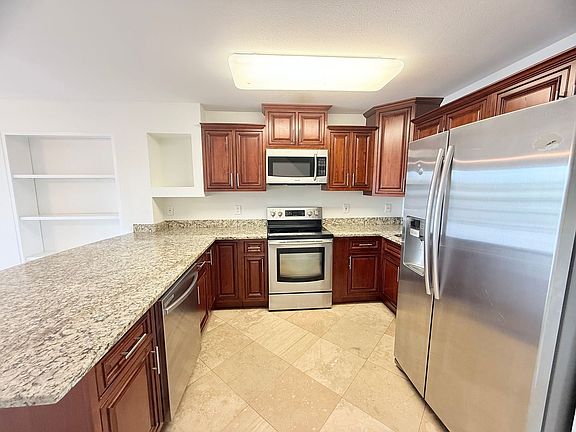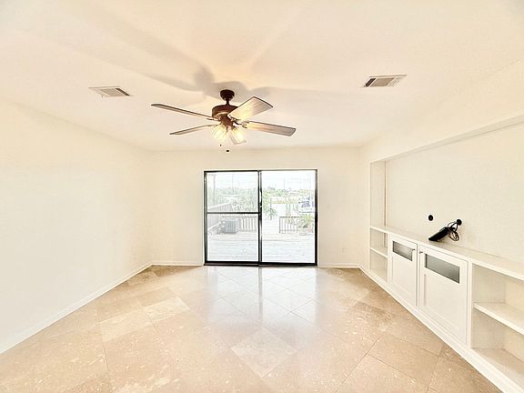 Inside, the bright and open kitchen showcases solid wood cabinetry, granite countertops, a large peninsula with bar seating, a dual-basin sink, and stainless steel appliancesincluding a double door refrigerator, flat top range/oven, built-in microwave, and dishwasher. The spacious living area features tile flooring and beautiful built-in shelving. It opens directly to a private deck overlooking the water, where you can relax while taking in the stunning marina views.