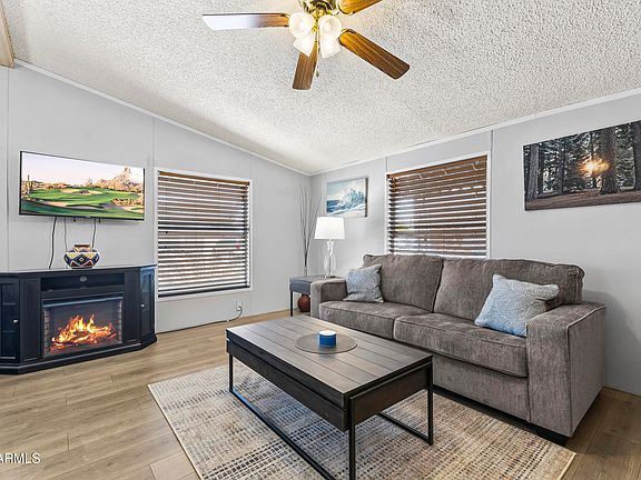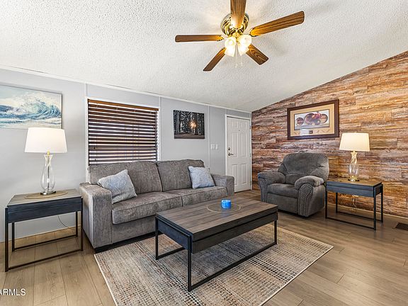 Welcome to Arizona and all it has to offer! Move in ready and furnished just waiting for a full time owner or even a winter visitor. User-friendly flow to this floor plan offers a large great room to watch big game and an open kitchen so you can visit with friends while you prepare the latest feast! The dining area is large enough to fit all your friends. When you get done with a round of golf or some pickleball, you can relax on your oversized covered patio to toast the beautiful Arizona weather and mountain views. Plenty of storage with 2 sheds as well throughout the home boasting lots of closet space, a large laundry room and bonus den/office with its own exit. The master bedroom bed is adjustable; the couch has a hideaway queen bed for when your family comes to visit from.... the cold Northern weather. All the furniture stays and much of it is newer and/or gently used. Within walking distance to the community clubhouse which has shuffleboard, a heated pool & spa, events area, kitchen, BBQ area, library and billiards. Some other features that are not to be missed: the electric heater under the great room TV and 2 storage sheds.