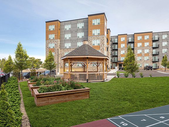 Outdoor gazeboOutdoor shuffleboard tableFitness centerCommunity roomLibrary with a fireplaceGarden boxes for residents