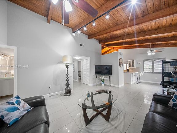 Welcome to this beautifully updated home in the highly sought-after Calusa Club Estates! This residence offers a perfect blend of modern upgrades and comfortable living, starting with its open floor plan and vaulted ceilings. The stunning eat-in kitchen is highlighted with elegant quartz countertops. Recent updates, including a brand-new roof from 2023 and a new A/C unit installed in 2024. All windows and doors are impact-resistant. The modern bathrooms have also been tastefully updated. Situated on an oversized lot, the backyard is a true oasis featuring a refreshing pool and convenient storage sheds, perfect for all your outdoor needs. The covered garage offers additional convenience and security. This home is a rare find, combining style, safety, and functionality in a prime location.