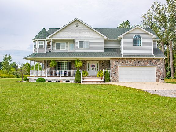 You must see this ideal country home located just minutes from I-275 on 9.85 partially wooded acres bordered by a creek and including a stocked pond. The 2,910 square feet hold 5 large bedrooms, 2 and a half baths. The master bedroom has a private bath that includes whirlpool jets. Main floor has hardwood and tile flooring, upstairs has carpet. The full finished basement is a generous 910 square feet. The kitchen has updated appliances, a large dining area, and it connects to the first floor laundry and attached garage. Exterior siding is part stone and part vinyl. A wrap around porch connects to a 60' x 25' deck, perfect for hosting family events. The home has a newer forced air furnace, 1000 gallon new propane tank, and city water!!! The 40' X 60' pole barn with 14 ft walls and concrete floors provides ample space for recreational vehicles and more. Well-maintained and move-in ready, this spacious home boasts peaceful living with options for hunting and fishing.