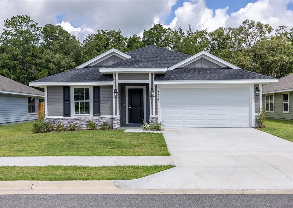 Seller concessions include a special finance rate of 4.99%. The rate applies to builders' preferred lender, Acrisure Mortgage, which utilizes FHA, VA, USDA, conventional loans, or up to $25,000 towards closing costs. SAVANNAH STATION A, FL, is a quiet, country-like area close to all your shopping needs—Three-bedroom, two-bath MOVE IN READY, 1512 SQFT. LOT 258 has hardy siding, stacked stone accents on the exterior, and a large front porch. Great location close to Gainesville, Alachua, and Lake City. It features LVP in the wet areas and throughout the main home, excluding the bedrooms, dining room, family room, and a leading area out to the backyard with a new fence. The spacious primary suite features a double-door closet, a granite double-sink vanity, a walk-in shower, and a garden Tub. The kitchen area features a large granite island that overlooks the Family room. This prominent kitchen features upgraded cabinets, granite countertops, a stainless steel Frigidaire appliance, a range, a dishwasher, a microwave, and a disposal. Brushed Nickel Faucets, LED lighting, and a Built-in pest defense system. Energy-efficient HVAC system. Taxes are based solely on land taxes. Prices are subject to change without notice.