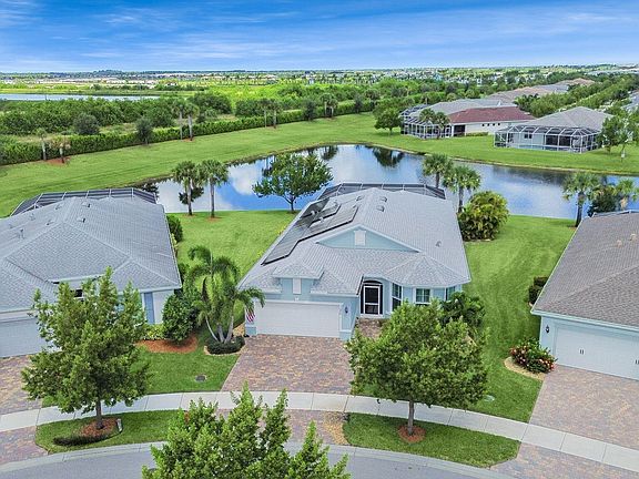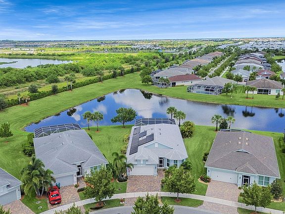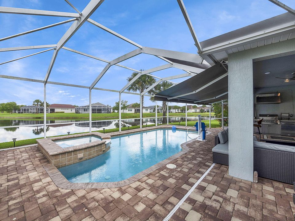 Waterfront, POOL + Jacuzzi home on an oversized PIE SHAPED lot in the beautiful 55+ Del Webb at Tradition - this one is a MUST SEE! Loaded with high-end upgrades and thoughtful design, this exceptional home offers luxurious, low-maintenance living both inside and out. Step into an elegant interior featuring upgraded tile flooring throughout, crown molding, whole-house plantation shutters, and custom lighting. The chef's kitchen boasts upgraded cabinetry, quartz countertops, and high-end appliances. Enjoy Florida living year-round with a heated saltwater pool, screened enclosure, custom paver patio (Pavers in front and back resealed every two years), extended side patio with a remote-controlled awning for added shade, and a custom built summer outdoor kitchen perfect for entertaining. Built for comfort and efficiency, this home includes a whole-house Generac generator, tankless water heater, smart home wiring, and complete impact windows and door. The extended garage offers a 10x10 alcove, attic storage with pull-down steps, and an extra-wide driveway. Situated on an oversized pie-shaped lot with 30 extra feet on each side, it offers enhanced privacy, long lake views, and stone landscaping along the perimeter.