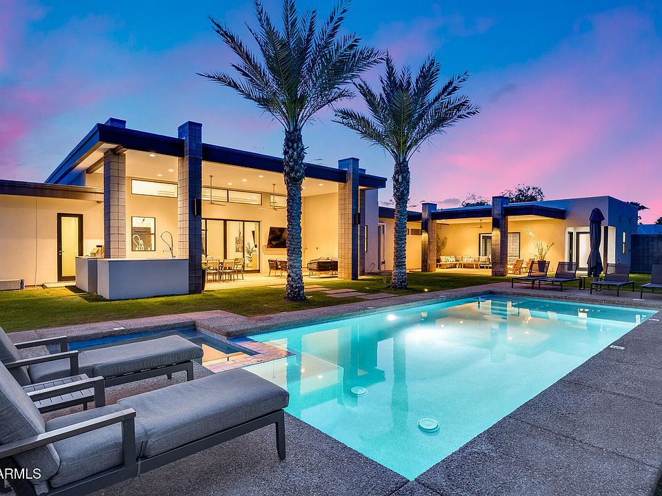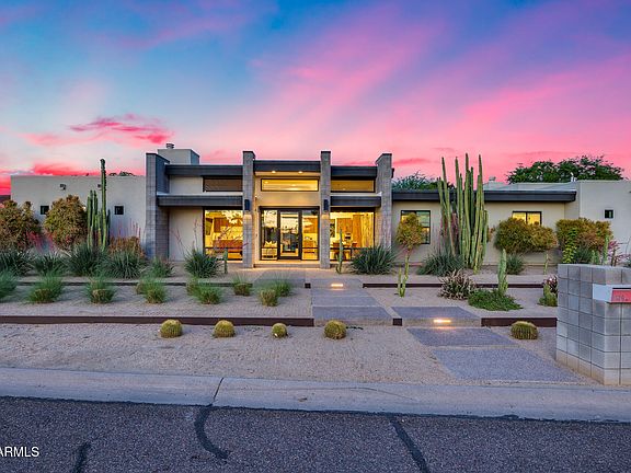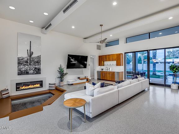 This luxurious residence has been meticulously upgraded to exude sophistication with modern design elements and elegant finishes throughout. Situated in a prime location, it boasts unique curb appeal that stands out in the neighborhood. The main residence features 4 bedrooms, 3 bathrooms, a den, and a great room with soaring high ceilings, a wet bar, and stunning Terrazzo floors. The gourmet kitchen is complete with sleek high-end cabinets, white countertops with a waterfall island, and stainless steel appliances, including a gas cooktop. Floor-to-ceiling glass doors open to a spacious covered patio overlooking a resort-style backyard with a sparkling pool, built-in BBQ, grassy area, and lush landscaping - an entertainer's paradise. Additionally, the charming guest quarters offers 635 sq/ft of space and privacy. With no HOA, this home is the perfect blend of luxury and convenience that's just moments away from Old Town Scottsdale and easy access to the 101!