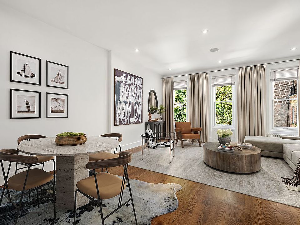 The apartment itself has been restored, blending modern upgrades with historic charm. Inside, you'll find a steam shower, recessed lighting, built-in surround sound, and two mini-split systems for central air. Yet some of the original character remains intact, with hardwood floors, high ceilings, cast iron radiators, and working pocket shutters that highlight the home's pre-war heritage.