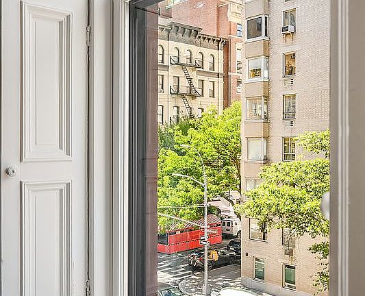 Located three flights up in a private townhouse-style building, the residence offers an entire floor of quiet, privacy, and boutique character, something rarely found in typical high-rise towers. Serene east-facing views overlook the lush townhouse gardens of East 91st Street, filling the generous living and dining area with natural light. The west facing windows offer a timeless view over Madison Avenue.