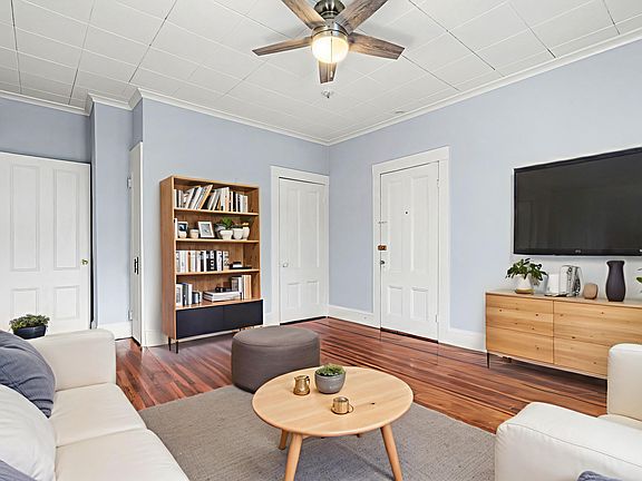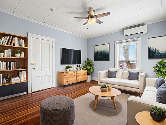 Central air conditioningPrivate balconyElegant quartz countertopsHardwood floors throughoutFully renovated kitchenDedicated off-street parkingGas cooking