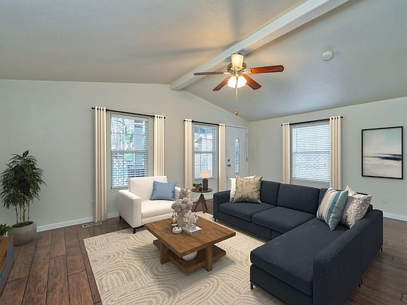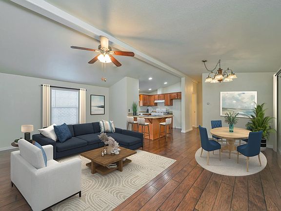 Nestled in the desirable Diamond Manor senior park, this charming 2-bedroom, 2-bath home offers a bright, open floorplan with vaulted ceilings and modern laminate flooring. The kitchen features recessed lighting, an eating bar, and ample cabinetry, flowing seamlessly into the living and dining areas. Both bedrooms are generously sized, including a primary suite with a private bath and grab bars for added safety. A separate laundry room provides extra storage, while the covered front porch with composite decking offers a perfect place to relax. Additional highlights include a Generac generator with transfer switch, storage shed, covered parking, and nearby guest parking. Situated on a corner lot directly across from the clubhouse, you'll enjoy easy access to Diamond Club amenities such as a community kitchen, pool table, heated pool, and inviting patio areas. Base space rent for the new buyer is $829/month plus utilities.