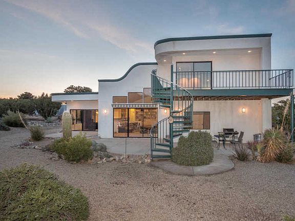 Custom contemporary 2946 sqft 3 + 2.5 home on 9.8 acres with expansive views located in Juniper Hills. This beautiful Art Deco style home designed by an architect offers an open floor plan, fireplace in the living room, and gourmet kitchen with high-end appliances, sub-zero refrigerator, granite counter tops, and European cabinets. The upstairs master bedroom has a large deck to enjoy the incredible views of the mountains and the rocks of Devil's Punch Bowl Park. There are grid-tied solar arrays totaling about 2720 Kilowatt. Imagine having little or no electricity charges! A few of the other special features of this home are two dual-fuel heat pumps with propane auxiliary heat, heated garage, and new low-e glass in all downstairs sliding glass doors and in the upstairs master bedroom