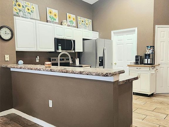Newer appliancesWood look tileOpen conceptSpacious pool deckVaulted ceilingsSplit planLiving and dining area