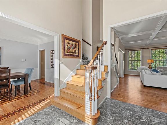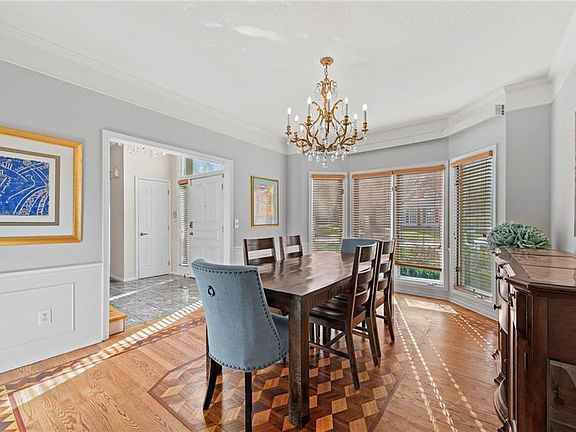 Upstairs, the primary suite delivers size and function, featuring a full sitting room, dual oversized walk-in closets, and natural light that showcases every corner. The formal dining room brings character with custom inlaid hardwoods and European chandeliers that elevate the space.