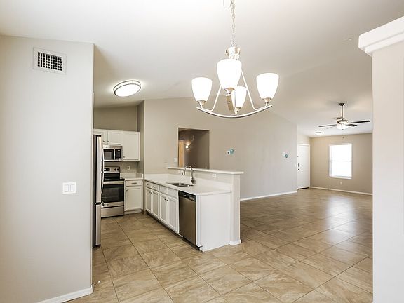 Check into this lovely four-bedroom, two-bathroom rental home in El Mirage. This charming home boasts a two-car garage and fenced-in yard with a large backyard and covered patio. The open floor plan offers a living area that inspires conversation and features an airy front room with a ceiling fan and an adjoining eat-in kitchen with stainless steel appliances, quartz countertops, and a large pantry that provides extra storage space. Adjacent is a generous dining room naturally brightened by the sunshine streaming through side-by-side windows. The 1,530-square-foot floor plan also includes a luxurious owner's suite complete with a private bathroom and a large walk-in closet with shelving. Schedule your tour today.