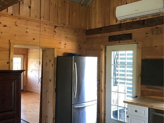 A Rustic Diamond is for sale in Henderson. Originally a log cabin, this farmhouse has been completely updated while retaining its historic integrity. Two bedrooms on the first floor, the master bedroom has a modern bathroom and a deck to watch the abundant wildlife. The second bedroom was the original log cabin that has been updated with electric outlets and walls/ceiling completely insulated. A country kitchen is complete with gas range, range hood, dishwasher, and refrigerator. A freestanding cabinet can be used for pantry supplies. Some original wood floors remain along with some vinyl plank flooring. The steel roof was completed seven years ago along with R45 insulation in the ceiling and R42 insulation in the walls. A first floor laundry is complete with a washer and dryer, a whirlpool tub, modern shower, sink, and toilet. There is a freestanding propane fireplace in the cozy living room and mini split adds year round comfort. An open loft with original floor boards and exposed hand hewn beams offers additional possibilities for bedroom, storage, or game room. A back room could be used for storage, pantry, or work shop. There is a hand dug well in the cellar and a sump pump. Exterior features include a rain water reclamation system with storage tanks that could also be filled via a water delivery service. The detached garage ha 100 amp electric service with a single car bay, a potting shed, and an additional storage area, hence a "He Shed, a She Shed, and an animal shed"! The 0.9 acre lot has mature trees and a large open area for a garden, a gazebo, a fire pit, or whatever the new owners can dream of.