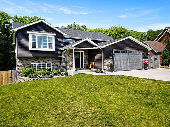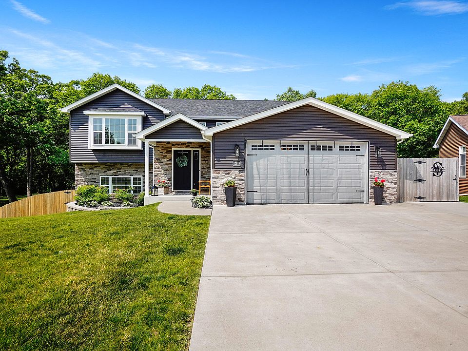 This gorgeous, custom split-level home on a premier lot is a neighborhood show-stopper. Open concept living, dining, kitchen area is great for entertaining. Dining area has beautiful ceiling detail with skylight. Kitchen features island, quartz countertops, and stainless steel appliances and pantry. Living room has vaulted ceiling and large windows with modern lighting. Large deck off the kitchen welcomes you to the expansive fenced backyard with massive patio and storage shed. Primary bedroom has tray ceiling, walk-in closet and spa-like attached bathroom with double vanity, large soaker tub and separate shower. 2 additional bedrooms as well as a full hall bath complete the upper level. Walkout lower level with extra-high ceilings has 4th bedroom with walk-in closet, full bathroom, finished laundry room, and expansive 2nd living room/rec room. There is also roughed-in plumbing for future wet bar. 2.5 car attached, heated garage with floor drain and hot & cold water has recently been finished. All drywalled, insulated, attic sheeted with pull down staircase for additional storage. Extended parking pad and landscaping complete this beauty. Schedule your viewing today. This stunning home will not last long!