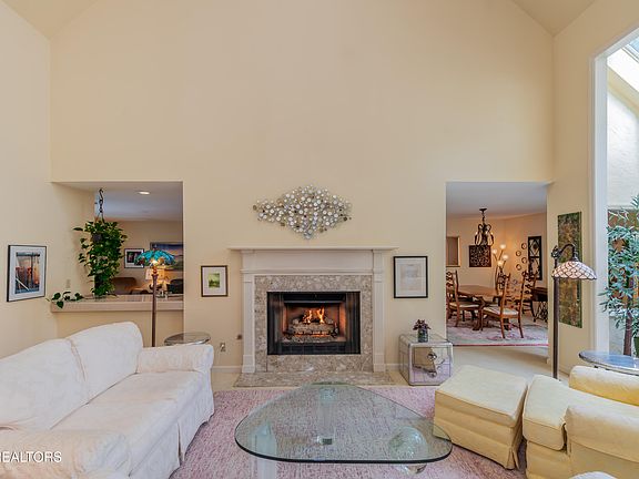 central focus is the cathedral great room with marble trimmed fireplace with gas logs, framed with a painted traditional mantel with dentil molding.Also, featured is the stunning sunroom with tile floors & skylights. The formal dining room with crown molding opens to the Kitchen with white cabinets, solid surface corian tops & stainless appliances opening to a cozy den with views of the private landscaped patio. Main level Primary Bedroom suite features an enclosed patio, walk-in shower with glass doors, whirlpool tub neutral tile floors.. The dressing