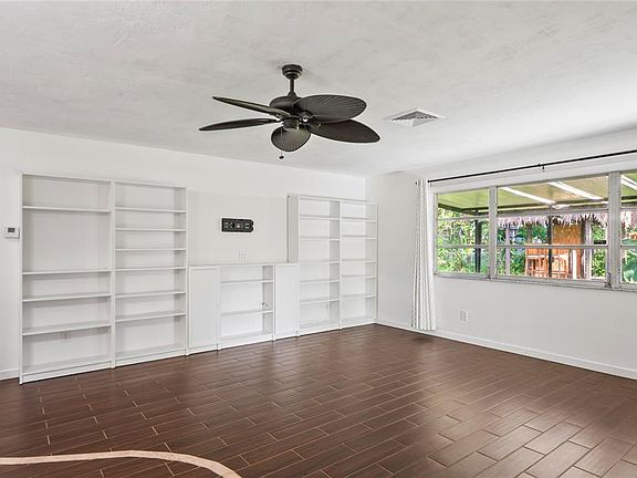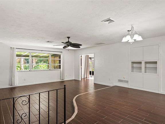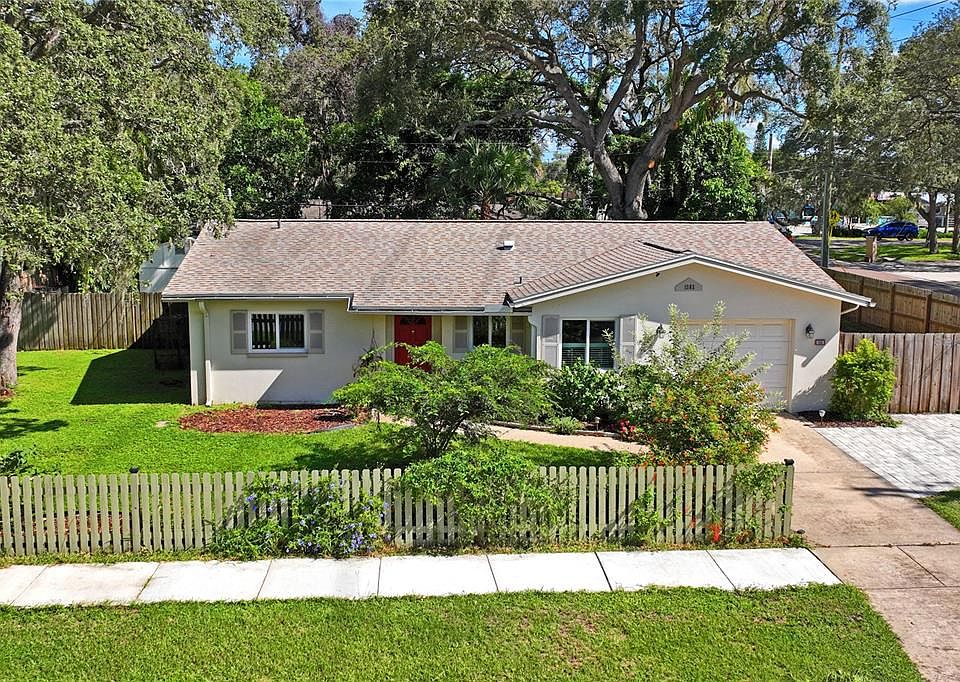 This updated home offers a blend of modern convenience and classic charm, making it an ideal rental. It features a newer electrical panel for peace of mind, a new roof, new A/C and ductwork, and new impact windows in the kitchen and bedrooms. The light and bright kitchen opens to a breakfast area overlooking a lovely front garden. The living room is a welcoming space, boasting new tile flooring and newly built-in shelving. The master bedroom, with its own full private bathroom and French doors, provides a versatile space. Sliding glass doors lead from this bedroom to a gorgeous screened-in back patio and an additional open patio. The second and third bedrooms feature Terrazzo flooring and spacious closets. Outside, you'll find a private, fenced-in backyard oasis complete with a newly built gazebo, perfect for entertaining. The large, treed lot includes side yards with ample space for your boat and RV. A large shed offers plenty of storage. Lawn care and exterior pest control included in monthly rent!