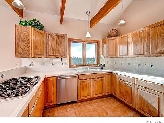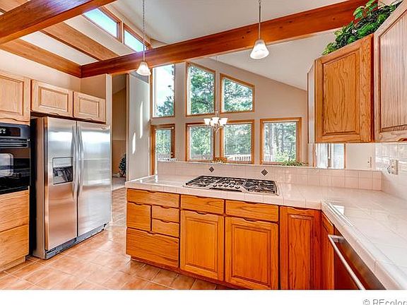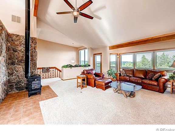 Stunning mountain contemporary ranch style home perfectly situated on a gorgeous 5 acre treed lot to capture the spectacular 360 degree panoramic views! Open floor plan with vaulted ceilings, skylights, & abundant windows to bring in the natural light. This beautiful home has been well maintained & updated by the original owner. Chef's kitchen with double sink, newer faucets, newer lighting, & newer appliances including: Thermador 5 burner gas cook top with 2 simmer burners, Bosch dishwasher, GE refrigerator, microwave & wall oven. Spacious master has 5 piece bath with jetted tub. Great room with wood burning stove & moss rock wall. Newer carpet, newer interior paint and some new windows in 2005. Newer 30 year roof, new redwood deck in 2012, new exterior paint and deck stain in 2015. Near bike & hiking trails, horse stables & Pike National Forest. Only 5 minutes to Bear Dance Golf Course, 12 minutes to Castle Rock, & 25 minutes to DTC or Colorado Springs. Buyer's Warranty included.