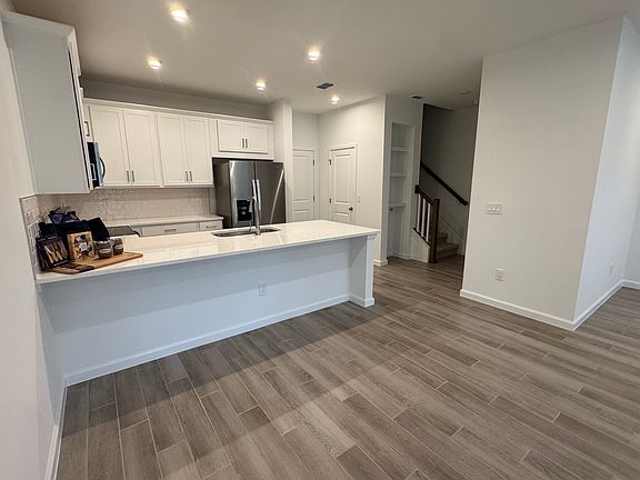 Downstairs has an open plan kitchen and living space, 1/2 bath and access to the attached two car garage. Upgraded tile flooring, kitchen countertops and cabinets.