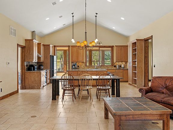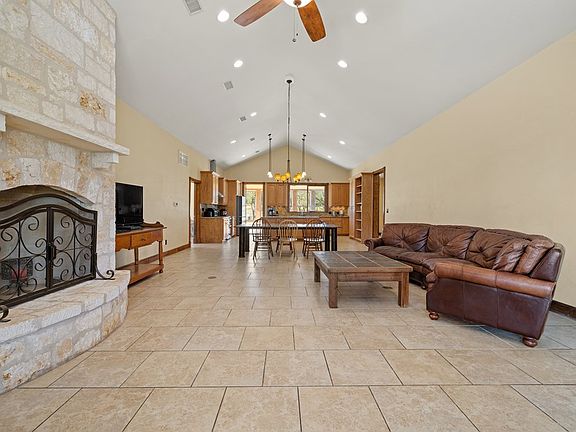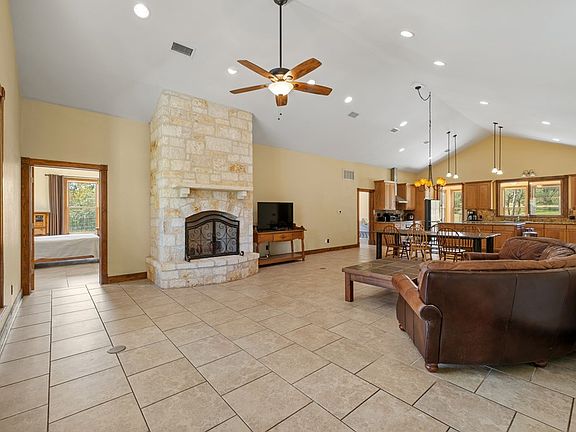 Discover this charming Hill Country-style home, built in 2011, nestled on 10 pristine acres of meticulously maintained land. The property is fully enclosed with a 7' high fence and features an electric gated entrance for privacy and security. This spacious 3-bedroom, 2-bathroom residence offers a warm and inviting atmosphere with a limestone wood-burning fireplace and a thoughtful split floor plan. Enjoy the tranquility through double-paned windows and the durability of a standing seam roof. The well-appointed kitchen boasts a stainless steel farmhouse sink, a large 4'x7' granite island, and custom oak cabinetry. All appliances convey. 12'x19' sunroom located directly off of the kitchen to watch sunsets each day with a separate mini-split unit. The dining area features a stunning Phil Jackson granite table that comfortably seats 8, which conveys with the home. The oversized master suite provides a luxurious retreat, complete with an en suite bathroom featuring a relaxing soaker tub, an extra-large shower with a built-in seat, and a walk-in closet that also serves as a panic room. The two car detached garage is 875 sq ft and is completely finished out with 2 - 10x10' storage rooms. STR permitted if the main home is full-time residence. This property perfectly combines rustic elegance with modern comfort, making it an ideal escape in the Texas Hill Country.