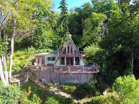 Drive right up to this south facing retreat on .6 acre w/105' of med-bank waterfront. Includes oyster beds, geoducks, salmon fishing, whales, plus fenced in garden space & easy beach access. Big views of Mt Rainier & Commencement Bay from the home as well as the entertainment-size deck and hot tub. Light-filled, private 2 bdrm, 1 bath has views from nearly every room, even from the clawfoot tub! New plumb/elec 2000. Roof is 3 yrs old with lifetime guarantee. Tons of built-ins. Cozy & turnkey!