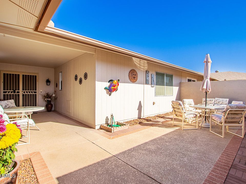 A charming courtyard invites you in, setting the stage for a warm and welcoming space. Inside, you'll find a bright living and dining area with neutral tones and easy-care tile flooring throughout. The kitchen is a chef's dream, featuring granite countertops and backsplash, recessed lighting, plenty of cabinet space, built-in appliances, and a pantry. Both bedrooms include spacious walk-in closets, while the main bedroom offers a private ensuite. The 2-car garage comes with built-in cabinets for extra storage. Step outside to a peaceful backyard with a covered patio, perfect for relaxing afternoons. This corner lot gem also gives you access to incredible community amenities like a golf course, spa, & pool!