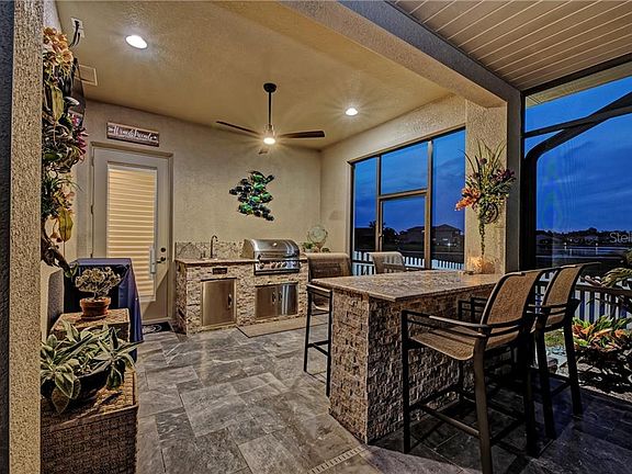 Come live the perfect Florida lifestyle. From the moment you pull up to this warm & welcoming home prepare to be amazed! With 2,782 sq.ft. of living space, 4 bed, 3 bath & 3-car garage on a large corner lot - enjoy the magnificent view of the private saltwater pool & lakes beyond. New paint in and out, the split floor plan offers privacy & space for family & visitors. Renovated and decorated with outstanding, custom features including engineered hardwood floors, Bahama shutters, chef's kitchen w/ wood cabinets, solid surface counters, gas cooktop, wine cooler, large breakfast nook, top of the line s/s appliances, custom wood built-ins closets throughout, custom light fixtures, ceiling fans & wine bar! Exterior upgrades include an extra large lanai area featuring an over-sized cage, remodeled outdoor kitchen and bar, salt water pool with great water feature, marble decking and a large covered sitting area, tile roof, professionally landscaping w/ great lighting & fenced yard! See the attached list & view the virtual tour / photo gallery to truly appreciate this amazing property! The popular community of Greyhawk Landing is gated & secured offering activities for all ages - enjoy the resort style community pools, with water park, clubhouse, fitness center, lighted tennis court, basketball courts, baseball & soccer fields, playground & miles of hiking & biking trails & fishing. Just a short drive to Lakewood Ranch, the Ellenton Outlet & UTC Malls & our world famous Gulf beaches.