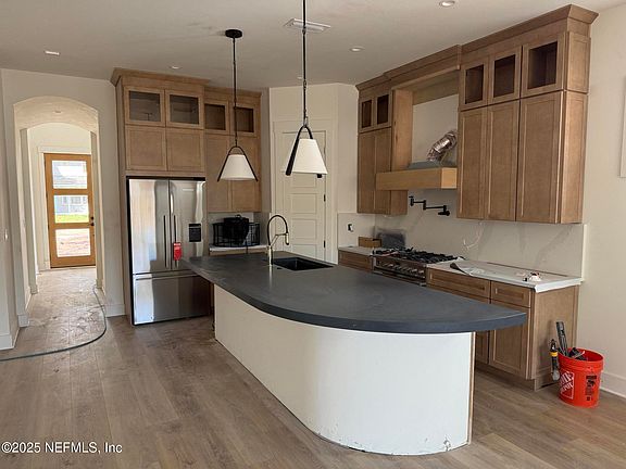 Brand-new custom build by Bachmann Homes, just blocks from the ocean! Thoughtfully curated with designer-selected finishes, this 5BR/4.5BA residence blends coastal luxury with modern comfort. Double French entry doors reveal the foyer with soaring 20-foot ceilings and an open staircase, creating a memorable first impression. The open floor plan showcases a gourmet kitchen with sleek high-end appliances, custom cabinetry, and a striking curved island feature. The first-floor owner's suite includes a spa-like wet room with freestanding tub. Upstairs, a private guest suite with its own bath ensures comfort and privacy, while every bedroom is filled with natural light and includes a walk-in closet. Outdoor living shines with an expansive 3-panel slider that connects to the covered patio and summer kitchen—perfect for entertaining. Modern finishes with bold accents create a timeless, inviting feel. A dream retreat in the heart of Jax Beach!