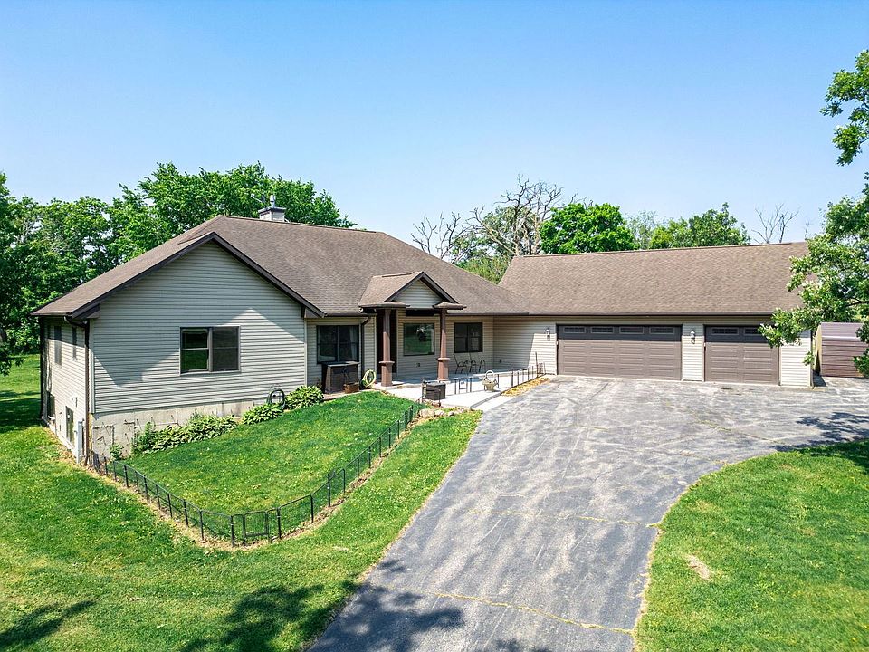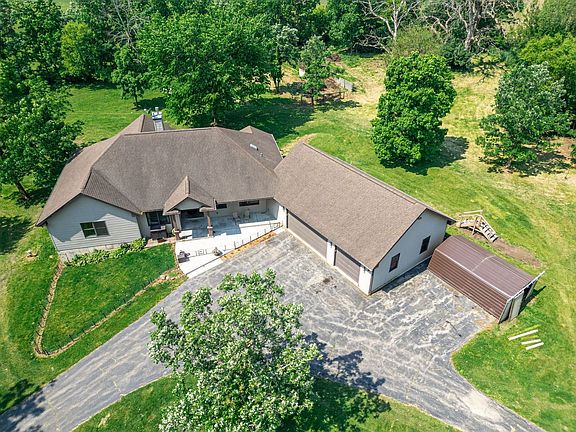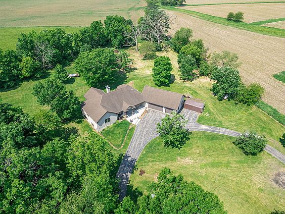 Attention homesteaders and hobby farmers! Rare 5-acre property zoned agricultural in Boone County. This secluded property features established fruit and nut trees on land naturally fertilized for 15 years by grass-fed cows-no chemicals ever used-ready for your gardens. Grow tomatoes as tall as you! Fenced pasture with animal shelter and feed bunk is perfect for 4H or FFA projects.The custom-built home was thoughtfully designed for comfort, practicality, and plenty of storage. Large windows fill every room with natural light and offer views of visiting deer and wild turkeys. Step into the spacious mudroom with three oversized closets for all your outdoor gear. The expansive open-concept kitchen, living, and dining areas make it easy to prepare meals while staying connected with guests or household members. Custom reclaimed barn wood cabinetry is topped with generous granite counters, and the commercial-grade appliances are ideal for baking, canning, or everyday cooking. A walk-in pantry provides space for both equipment and homegrown preserves. Two bedrooms share a Jack-and-Jill bathroom, and a large den offers the perfect space for a home office, study area, or creative studio. Wide hallways and open rooms make the home accessible and comfortable for all. The 2,700 sq ft basement with large windows and roughed-in bath is ready for your finishing touches-radiant heating is already installed throughout the basement and garage.The luxurious primary suite features a spa-inspired bathroom with heated floors and a custom-built walk-in closet-your own peaceful retreat. Relax on the welcoming front porch with morning coffee, watch the hummingbirds, and enjoy the wide-open space around you.