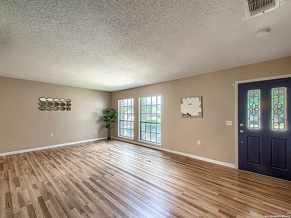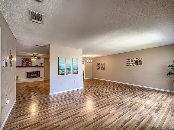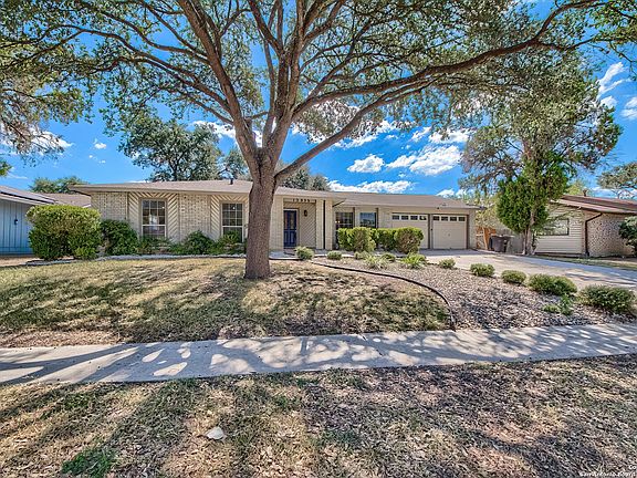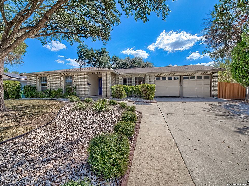 NEVER WANT FOR SPACE IN THIS AFFORDABLE SINGLE STORY BRICK RANCHER WITH NEW ROOF, FRESH PAINT, NEW LUXURY VINYL FLOORING AND A WORKSHOP! Well loved for decades by the same owners who raised their children here, this spacious single story is ready with open arms to welcome you in and turn all your possibilities into realities. Wind through the wide, tree-lined streets leading through Valley Forge and glide up to this charmer beneath mature trees and accented by smart xeriscaping and lawn. Open living is just a start to this traditional home modern comforts that offers more than you thought you could ask for at this price including a huge game room/sunroom and workshop on a slab, fully outfitted for all your projects! Step past the welcoming front porch and into the foyer to find a formal living room adjacent to a formal dining that is separate but still open to the family room and kitchen. A centerpiece, wood burning, brick fireplace with long hearth sets a cozy atmosphere in the family room that adjoins the breakfast nook. Offering original real wood cabinetry and plenty of countertop to work with, the kitchen is ready to go now or renovate to add your personal choices for upgrades. The adjacent laundry room includes cabinetry and shelving and leads into the two-car attached garage with pull-down attic access, storage cabinets and workbench. The primary suite is quite the production with one large room that hosts the adjacent ensuite bath, accessible with spacious walk-in shower with grab bars and no lip. But that's not all! Another doorway leads into the real retreat with beamed vaulted ceiling, two closets and tons of space for a third living area. Or, vice versa, use the first space as an office, exercise room or hobby room and this private enclave as your palatial bedroom. The secondary bedrooms share a guest bath in the hallway leading back to the rest of the house. Just off the family room is a giant air conditioned space to use as you will -- imagine entertaining with the outfitted bar with long counter top, wine nooks and glass shelves or work a business from this room as the owners did both over the years. Outside find a concrete walkway leading to the 18X13 workshop, on a slab, with electricity and work tables. Just add tools and get busy or turn into an office with exterior access if that is what you need! The owner added a concrete walkway from the gate to the shop for ease of use. The nice sized, level yard shaded by mature trees offers enough space for outdoor activities including gardening and playscape. Or, add a swimming pool and make this a real all-encompassing live, relax and work place you'd never have to leave! Located in an ultra-convenient, well established neighborhood -- right off I-35 at O'Connor near 1604 in NE San Antonio -- an easy commute to military bases to include RAFB, SAMMC and Fort Sam as well as all the cool things to do downtown at the Riverwalk. Shopping and restaurants are just minutes away as are the NEISD schools the home is zoned to attend. If you work from home and/or run a business from home, or if multi-generational living is what you need, this property checks every box. There is no HOA to worry about, just city regulations, so feel free to have chickens and other options usually governed by HOAs. The new architectural shingle roof with 30 year shingles will help keep your property insurance costs lower than other homes. Don't wait for another opportunity like this to come along, run and see this one and make it your own.