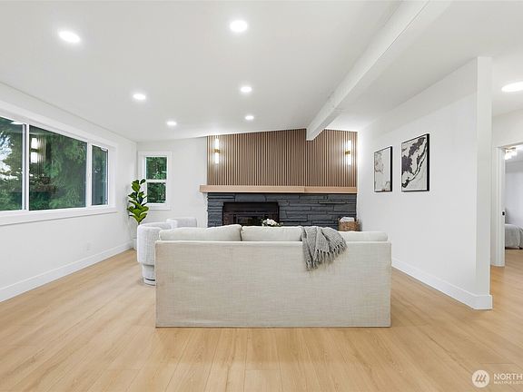 Welcome home to this beautifully renovated 4 bed/2.5 rambler that blends modern elegance with comfort and open space living. The home features brand new white oak kitchen cabinets with quartz counters, an oversized island and HEATED FLOORS throughout the house. The open concept kitchen and living room offer a spacious, airy feel, complemented by lovely mountain views. The bathrooms have been updated with tile, upgraded cabinetry and finishes. Situated on a large lot, the property includes a detached two-car garage and offers potential to build up to two DADUs (buyer to verify). Conveniently located near many amenities and Lake Washington! This home offers both luxury and opportunity in an exceptional setting.