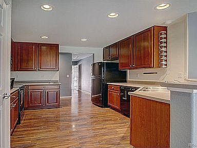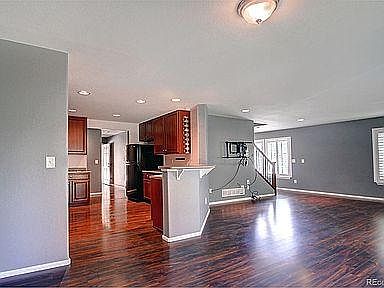 Beautiful 4 bedroom condo favorably located on a corner lot with lush mature landscaping. Rich engineered hardwood floors paired with warm carpet through the home. Windows are dressed with plantation shutters Spacious semi-formal living and dining room is the center of the main level home. The kitchen has sleek black appliances along with plentiful cabinets. The bar provides extra countertop space and seating. The closet laundry setup is found in the main level hallway away from the living area. Follow the attractive hardwood and wrought iron railing to the upper level where you find 2 bedrooms, a full hall bathroom plus a gorgeous large primary bedroom with a private bathroom. Enter through double doors into the primary bedroom which also hosts a large master closet and bathroom with double sinks and a spacious linen closet. The additional upper full bathroom has a luxurious deep tub with shower. 2 car attached garage with entry into the main level. The home is conveniently located close to shopping, amenities, and I-25.