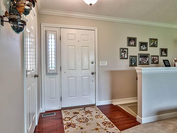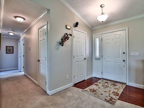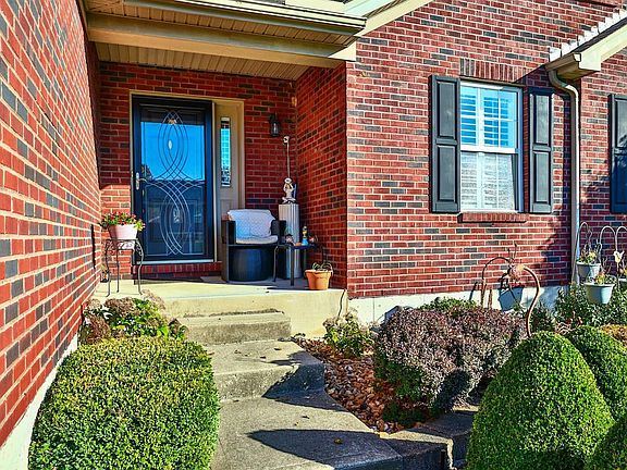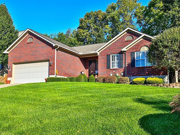 Beautiful brick front ranch home nestled on a private wooded lot. Soaring cathedral ceilings in main living area w/ crown molding. Large open living room offers walkout to the rear patio including newer pergola w/ privacy shades & peaceful views of nature. Kitchen features granite counters, gas oven range, hardwood floors, & tiled backsplash. Dining room w/ hardwoods adjoins the kitchen. High end plantation interior shutters throughout the home, fresh paint, 6 panel doors, & neutral décor. Primary suite boasts cathedral ceilings, overhead fan, private rear yard views, & adjoining modernized tiled bath w/ awesome walk in shower & granite topped vanity. 2 additional bedrooms & 2nd full bath w/ tiled shower/tub & granite counters. Huge basement has partially finished & carpeted area perfect for play room or multi purposed bonus room. Convenient built-in shelving in the storage area . Attractive multi gabled exterior, inviting covered front porch, mature landscaping, & 2 car garage w/ opener. Irrigation system & rear shed. Great location just minutes to interstate, restaurants, & shopping.