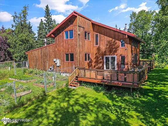 Discover the charm of this unique, rustic Alaskan home tucked away on a secluded hillside street, yet just moments from expansive parks and endless trails. Perfectly blending modern updates with natural beauty, this home offers comfort, character, and a true connection to the outdoors. The main floor features an updated eat-in kitchen with granite countertops, stainless steel appliances, a gasrange, and updated lighting. Gather in the stunning two-story great room, where floor-to-ceiling windows frame the outdoors and a cozy wood stove creates the perfect Alaskan ambiance. Step outside to the spacious deck and South-West facing backyard, beautifully landscaped with perennial gardens, fruit-bearing shrubs, raised beds, and native plants - a gardener's dream retreat. Also on the main level, you'll find a convenient room that can function as an office or 4th bedroom, full bathroom, and laundry area. Upstairs, two bedrooms share a Jack and Jill ensuite with dual vanities, a walk-in shower, and a generous walk-in closet. The basement provides a third bedroom that could also be used as a flexible space for recreation, hobbies with a legal egress window. Secluded yet connected, this hillside home offers the perfect balance of rustic charm and modern updates in a natural setting.