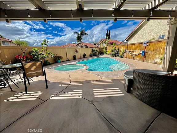 Calling all sunshine seekers! Ditch the crowded pool for your own backyard oasis in this charming 3-bedroom, 2.5-bath home! This Four Seasons beauty boasts a sparkling heated pool and jacuzzi, perfect for pool parties under the California sky. Inside, find a well-divided floorplan with a cozy fireplace for movie nights and a kitchen that flows seamlessly into a dining room ideal for poolside feasts. Solar panels keep the electricity bills low, so you can spend more on pool floats and fancy pool cocktails! Upstairs, the master suite offers a tranquil escape, while two additional bedrooms provide space for the whole crew. Convenience is key with a downstairs guest bath and a separate space that can be your formal dining room, game room, or your new yoga sanctuary. This quiet community offers the best of both worlds: close-knit vibes with easy access to freeways, shops, and even a Metrolink station. Plus, the HOA has another pool, tennis courts, and BBQ areas for those days you want to mingle with the neighbors. Move-in ready and bursting with potential, this gem won't last long! Make a splash and schedule a showing today!