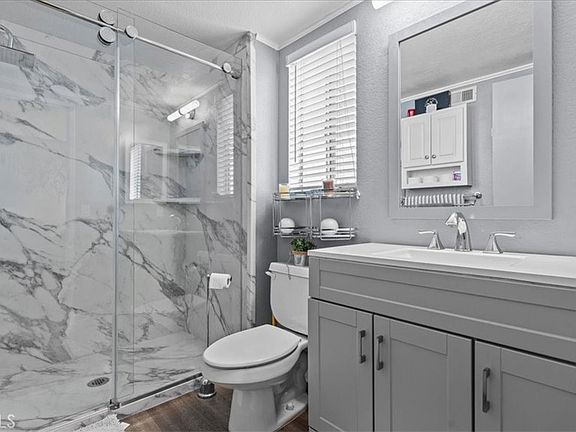 Inside, the home features new luxury vinyl plank flooring throughout for a fresh, cohesive feel. The remodeled kitchen showcases a custom tile backsplash, quartz countertops, and newer appliances, including a dishwasher, microwave, stove, and refrigerator—perfect for effortless everyday living.