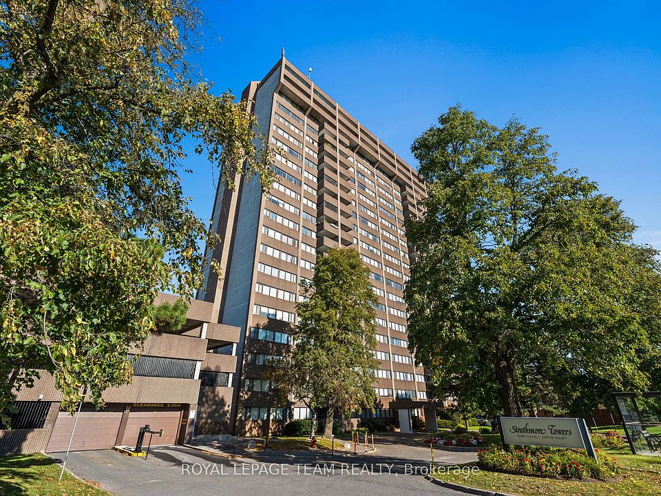 Welcome to Strathmore Towers! Beautifully maintained and perfectly located, this spacious 2-bed, 1-bath condo offers exceptional walkability just steps to South Keys Shopping Centre, restaurants, banking, coffee shops, and everyday essentials. The nearby LRT Transitway provides quick access to downtown, Carleton University, and the University of Ottawa, making this a truly convenient and connected lifestyle. Inside, a welcoming foyer with ceramic tile flooring leads to a bright, open living and dining area with rich parquet flooring and large windows that fill the space with natural light. A generous balcony extends your living area outdoors perfect for morning coffee or evening relaxation. The updated kitchen features raised-panel oak cabinetry, stainless-steel appliances (stove, dishwasher, hood fan), a white refrigerator, and an additional section of upper and lower cabinets for extra storage and workspace. A stacked washer and dryer are neatly tucked behind cabinetry. Two spacious bedrooms offer excellent furniture placement, complemented by an updated bath with a large vanity, oak cabinetry, and standalone shower. A generous linen/storage closet in the hallway plus a large storage room near the entrance provide ample space. Enjoy superb amenities including an outdoor pool, sauna, party room, guest suite, billiards room, and workshop. Condo fees include heat, hydro, water, and building insurance, plus one underground parking space. Immediate occupancy available. No pets and no smoking in unit, balcony or grounds. 24-hour irrevocable on all offers.