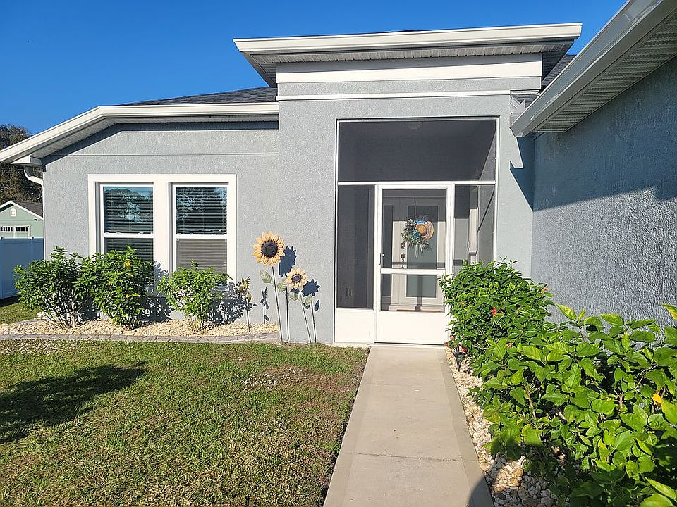 Front entranceWhole house guttersLarge screened patioAdded landscaping