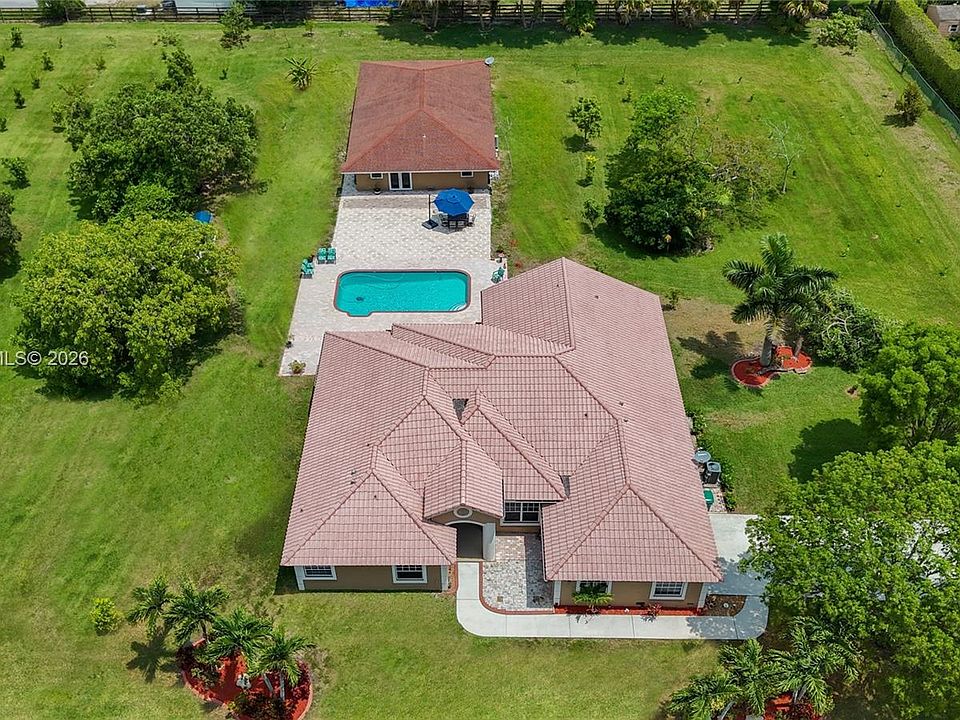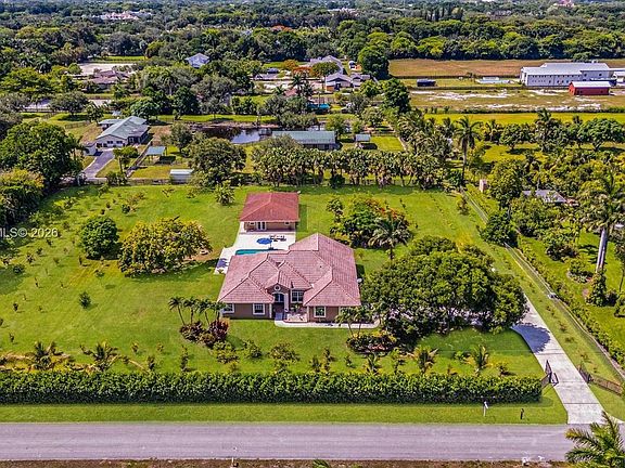 New Year, New Opportunity! Priced to sell. Well below appraised value. Fully fenced and gated 2.2-acre estate in equestrian-friendly Southwest Ranches. 5-bedroom residence plus a separate 2-bedroom guest house-ideal for multi-gen living, a home office, rental income, etc. The main home offers 3,000+ living sq ft, volume ceilings, abundant natural light, 2-car garage, and expansive driveway. The detached, updated guest house boasts 1,300+ sq ft, a storage room, private laundry, and a 3-seat Jacuzzi. Property features new A/C systems, new water heaters, new well pumps and water filtration systems. Newly installed municipal water line directly across the property, makes city water connection easy and optional if desired. No overhead power lines running through the property. Current agricultural exemption with citrus, tropical, and exotic fruit trees.