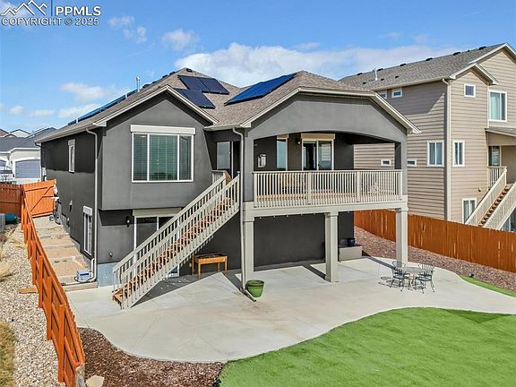 Nestled against open space with no rear neighbors, this beautiful 5-bedroom walkout ranch home is the perfect blend of comfort and charm. The expansive 25x10 covered back deck provides a peaceful retreat to enjoy the great outdoors with views of Pikes Peak and the beautiful morning sunrise. True main level living features an en-suite master bedroom with 5 pc bath including a brand new walk-in bathtub and large walk-in closet. There is an additional bedroom, full bathroom, a modern kitchen with a spacious island, upgraded to the max amount of cabinetry, granite counters, and large corner pantry. Additionally there is a cozy living room with gas fireplace, and a dining area with a walkout to the spacious covered back deck. There is a lift for added convenience to the lower level which offers 3 additional spacious bedrooms, a full bathroom, and a large recreation room, perfect for entertaining. Walk-out from downstairs to a beautiful 50x25 concrete patio, or play some games on the installed backyard turf. This home has many more upgrades such as air conditioning, beautiful hardwood floors and 15 energy saving SOLAR panels. This home is ideal for families looking for ample space, those who love to entertain, and anyone seeking the tranquility of backing onto open space. Schedule your showing today and make this dream home yours!