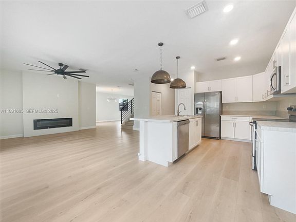 Welcome to your dream home located at 12856 SW 227th St, where the living room centers around a charming fireplace that sets a warm, inviting tone. The beautifully designed kitchen showcases an efficient island and all sleek stainless steel appliances, making meal prep effortless and conversation easy. The primary bedroom feels like a sanctuary with its generous walk-in closet, while the additional bedrooms offer a peaceful retreat for quiet rest. The bathrooms are fresh and thoughtfully finished, with the primary featuring double sinks for everyday convenience. Outside, unwind beside a private in-ground pool, dine on the patio, and enjoy the serenity of a fenced backyard that enhances privacy and relaxation.