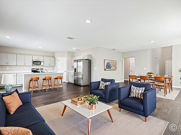 The open-concept kitchen serves as the heart of the home, featuring stainless steel appliances, quartz countertops, a large pantry, and a spacious island with breakfast bar seating. The kitchen opens to the living area and dinette, with sliding glass doors leading to a paved patio and a huge backyardperfect for outdoor entertaining and play.