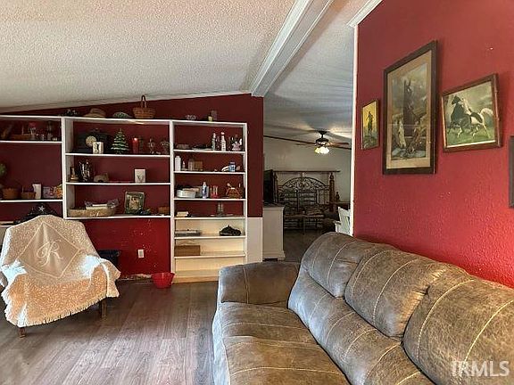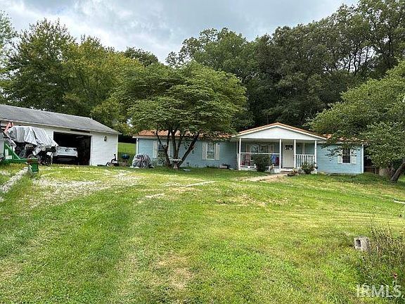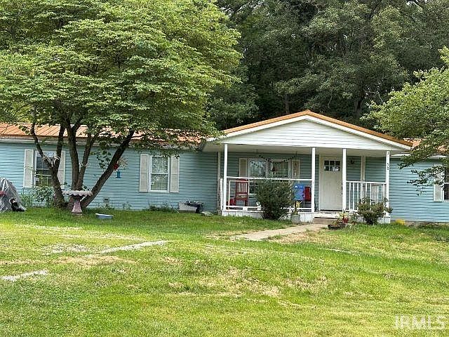 Manufactured home located edge of town in Loogootee on 1 acre near West Boggs Lake features kitchen, breakfast bar, dining area with coffee bar, family room with built in bookshelves, large living room, split floorplan includes master suite with double closets and shower with large tub, 3 bedrooms, and a full bath. Covered front porch and large 2-car detached garage. Stove, Refrigerator, and 2 window A/C are included.
