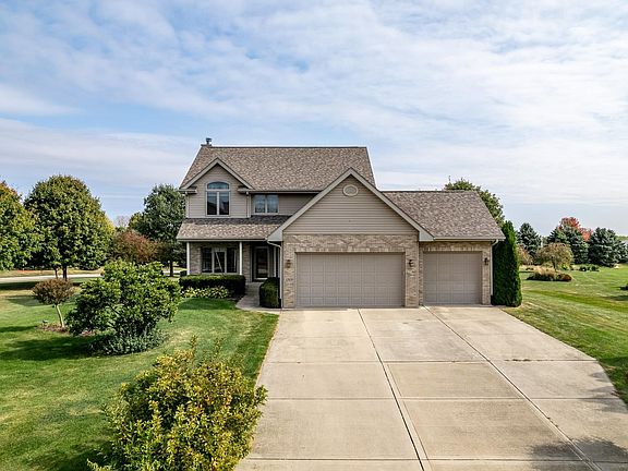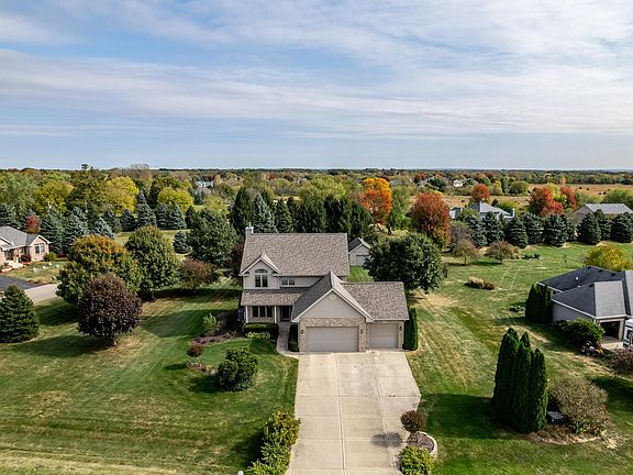 Elegant 4-bedroom, 2-story home nestled on 0.78 acres. The main level features 9-foot ceilings, a spacious great room with gas fireplace, and expansive windows that flood the living area with light, seamlessly connecting to the island kitchen, dining area, and sunroom. The kitchen boasts warm maple cabinets, stainless steel appliances, and a generous island with bar counter. Additional main-level amenities include a laundry room with washer and dryer, and a convenient half bath. Upstairs, the primary suite offers a walk-in closet and an en-suite bathroom with dual sinks, shower, and a jet tub. Two additional bedrooms and a full bathroom are also located upstairs. The lower level features partial exposure, a rec room, a fourth bedroom, and a third full bathroom. Outdoors, enjoy a multi-level deck with hot tub and patio, complemented by a 3-car attached garage and a detached one-car garage with electricity, flooring, and a workbench. Recent updates include a new roof 2022/ furnace, central air conditioning 2022/ dishwasher 2022/windows in upstairs bedrooms, sunroom & kitchen 2022/Carpet 2025.