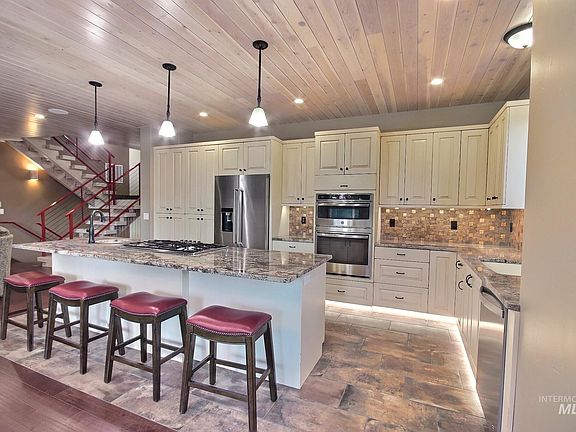 Discover your dream mountain lifestyle in this stunning retreat, where rustic charm meets modern luxury. Perched in the scenic beauty of Cascade, Idaho, this home offers an unparalleled living experience across three meticulously designed floors. Step into a world of warmth and sophistication, where natural elements blend seamlessly with contemporary amenities. The heart of this home is the expansive, open-concept living area, featuring a gourmet kitchen that will inspire your inner chef. Admire the sleek stainless-steel appliances, custom cabinetry, and show-stopping island with elegant pendant lighting – perfect for casual dining or entertaining guests. The living room beckons with its cozy stone fireplace, creating an inviting atmosphere for relaxation or social gatherings. Large windows frame breathtaking forest, lake and mountain views, inviting nature's beauty indoors and flooding the space with natural light.