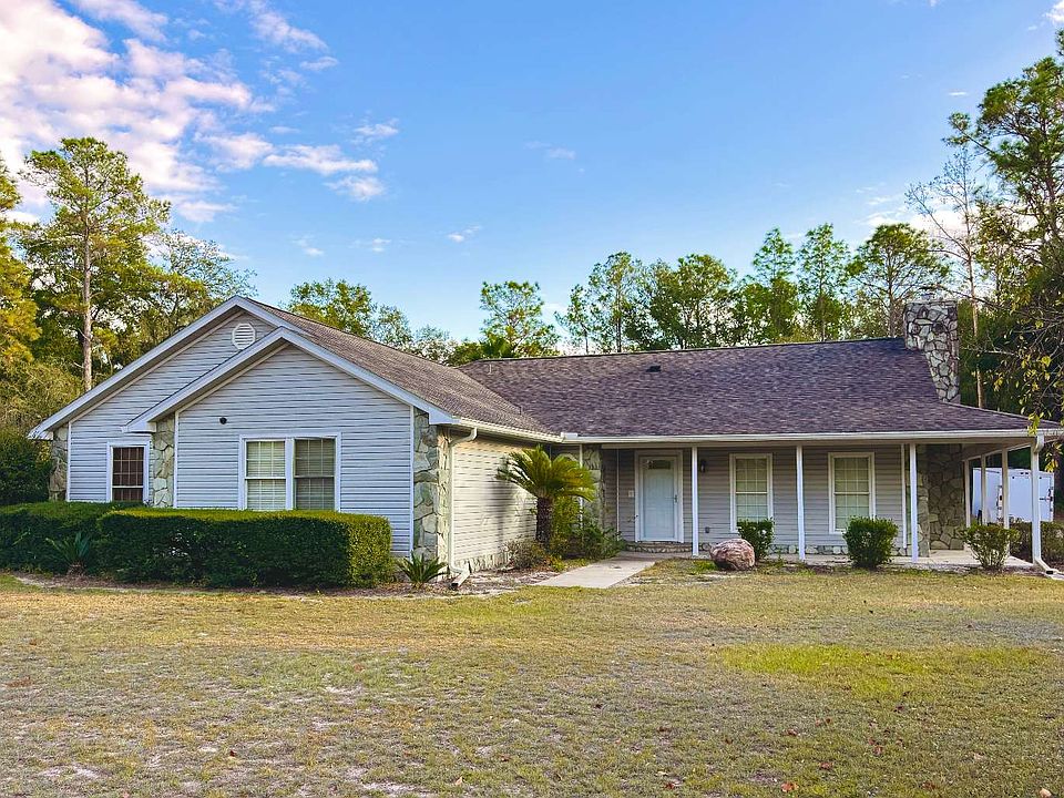Beautiful country home on 8+ acres located in Wellborn, FL, featuring a 2-car garage, 3 bedrooms, and 3 1/2 baths with a cozy fireplace. The property is landscaped with fruit trees and offers a private backyard oasis with a freshly resurfaced concrete in ground pool with palms and a tiki hut adding a tropical feel. It includes an outdoor fire pit on its own concrete patio. The yard is fully fenced with a privacy fence. Just behind the fence is a huge 72' x 40' workshop/barn with its own 40x15 man cave with a half bath. The workshop has a large loft and a carpenter’s station that provides a versatile space for projects, recreation, or unwinding. Includes 28 x 24 Concrete slab with power, water, and septic hookup for RV or Mobile Home. This property is a perfect blend of comfort, space, and country living.