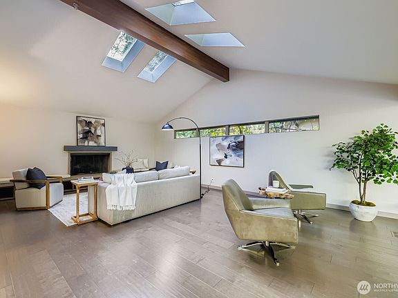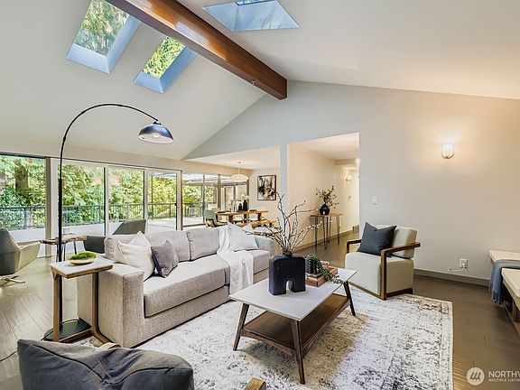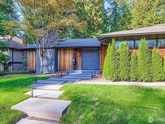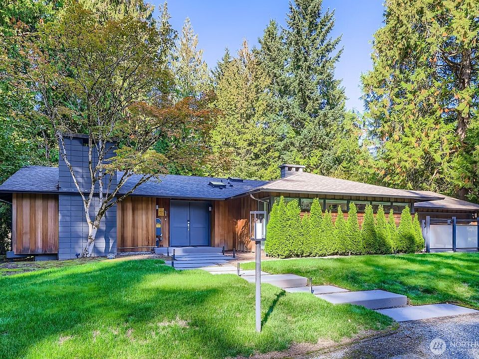 Welcome to an elegant mid-century home nestled within an exclusive community of 30 residence & only minutes to DT Bellevue. An extensive remodel in 2015 has enhanced its mid-century charm, with refined finishes and modern amenities. The home spans 2,200 square feet, featuring four spacious bedrooms and 2.5 luxurious bathrooms. Inside, enjoy rich hardwood floors, and a vaulted living room with skylights, complemented by a cozy fireplace and formal dining room. The gourmet kitchen is a chef's delight, equipped with S/S appliances illuminating your culinary creations. Step out onto the large Trex deck, perfect for a relaxing BBQ with friends and family in the private backyard set on an expansive 11,560 square foot lot. Coveted Bellevue SD