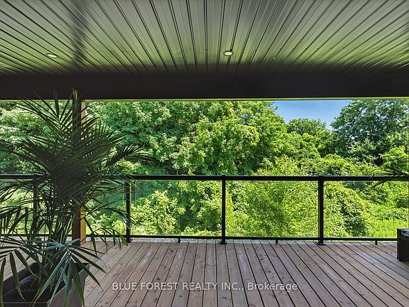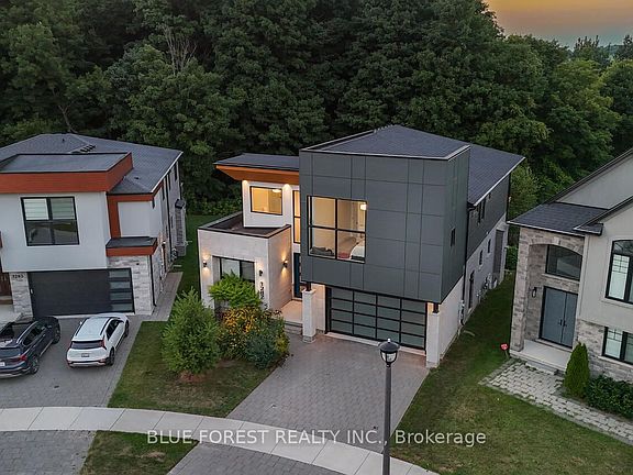This show-stopping North London 5 year old home offers the best of both worlds: sleek, modern urban style at the front and a nature-lover's paradise at the back. Boasting over 4,500 sq. ft. of finished living space, this stunning property is situated on a quiet, coveted street with panoramic sunrise and sunset views from both the front rooms and two rear decks. This home is just steps from schools, parks, a storm pond with biking paths, and public transit. Plus, it's perfectly positioned at the edge of town, ideal for weekend getaways through the countryside and nearby small towns. Step into a stunning open-concept main floor that's perfect for both everyday living and entertaining. The gourmet kitchen features quartz countertops, a full lineup of stainless appliances including a gas stove, a large island, and a spacious walk-in pantry complete with another sink and an abundance of storage. On the main floor, you'll also find a home office, designated dining room, main floor laundry, and a spacious living room with a gas fireplace. Upstairs, the luxurious primary suite includes two walk-in closets and a spa-like 5-piece ensuite with a tiled glass shower and a standalone tub. The upper floor also hosts three additional spacious bedrooms, a Jack-and-Jill bathroom, an additional full bath, and a second living room with stunning views, offering plenty of space for the whole family. The fully finished basement expands your living space with a massive rec room, an additional bedroom, and another full bathroom, making it perfect for guests or multi-generational living. At the back, enjoy the breathtaking beauty of nature from your two-storey glassed-in deck, ideal for relaxing or entertaining. The backyard is lined with peach, sugar maple, poplar, cherry and other fruit trees, attracting local wildlife and offering a peaceful, natural escape.