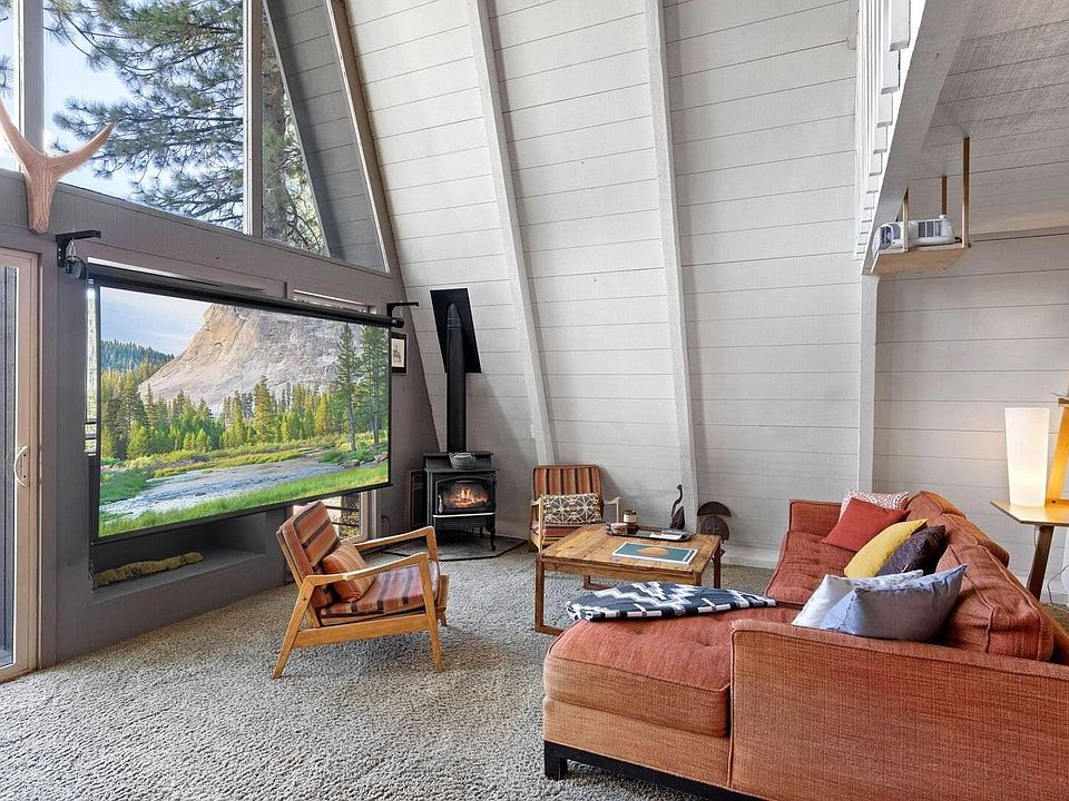 This charming 2-bedroom, 1.5-bathroom Lake Tahoe cabin exudes warmth and comfort. Step into the living space which boasts vaulted ceilings, stunning floor-to-ceiling windows, a cozy gas fireplace, and a massive retractable projection screen, a true treat for both movie enthusiasts and those who enjoy cozy nights in while watching the snowflakes fall. The open kitchen seamlessly connects to the main living space and comes fully equipped with everything you need. The main level also has a welcoming guest bedroom with a queen-size bed as well as the home's main bathroom, complete with luxurious dual rain showers.