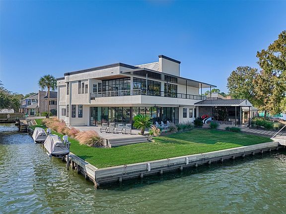 You won't find anything else quite like this on Lake Conroe! Completely renovated waterfront home nestled within the secure setting of Pelican Bay's gated community. A striking stucco elevation w/wood details & a meticulously manicured lawn greet you. The exquisite OPEN design & stunning floor-to-ceiling windows allow water views from almost every room. Open sophisticated kitchen w/ new cabinetry, sleek waterfall island, 5-burner gas cooktop, built-in Miele coffee machine & 2 ovens. Sitting area off kitchen & Dining enjoy a 2-sided fireplace. Wet bar off Living RM. Guest RM & full bath on 1st floor. Massive owner's suite w/2nd laundry RM. Owner's ensuite bath w/floating vanities, soaking tub & walk-through shower. 4 secondary bedrooms each w/it's own ensuite bath (one doubles as a media RM). Atrium/Game Room enjoys panoramic lake views. HOME WAS BUILT W/STEEL FRAMING! NEW ROOF (2024) NEW BULKHEAD, NEW BOAT SLIP & LIFT, 2 NEW JET SKI LIFTS (2021). 2 UPDATED A/C's. PULL FEATURE SHEET
